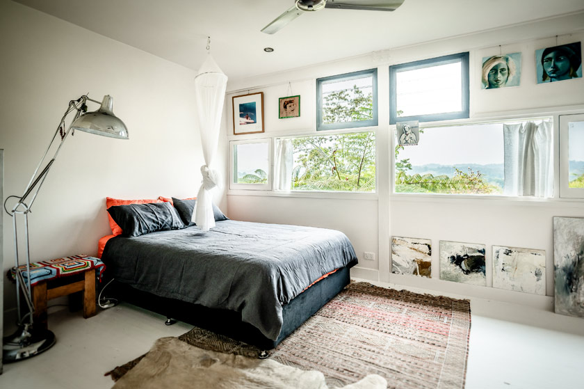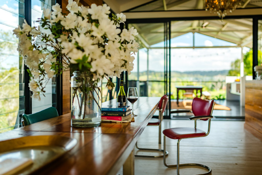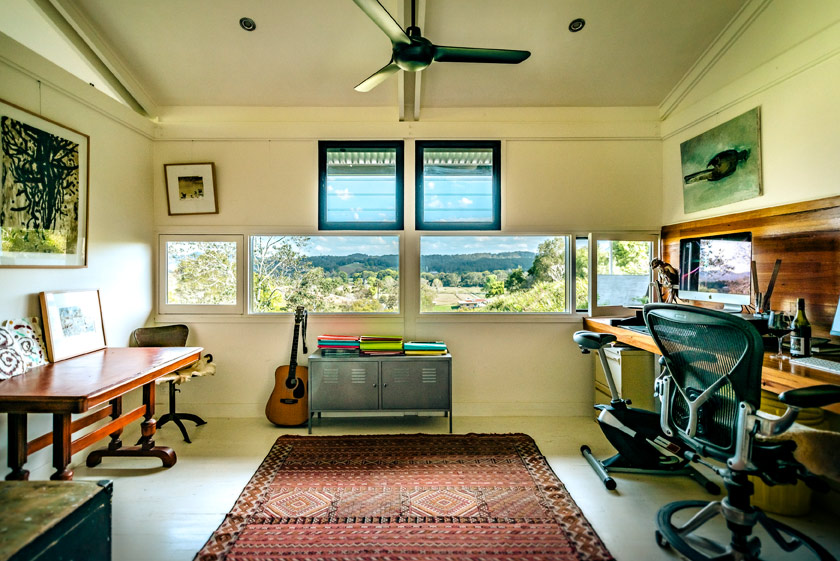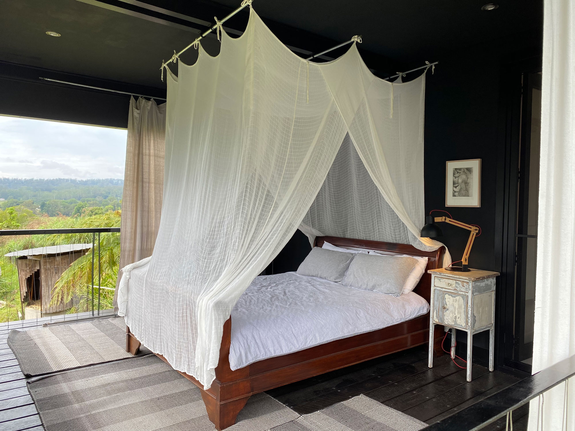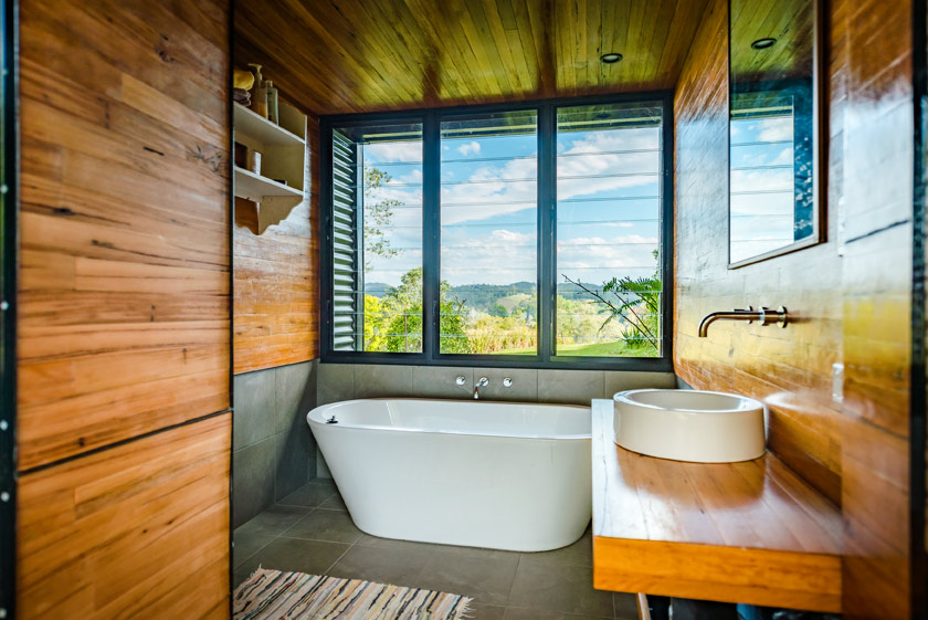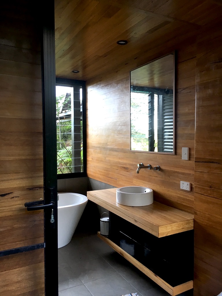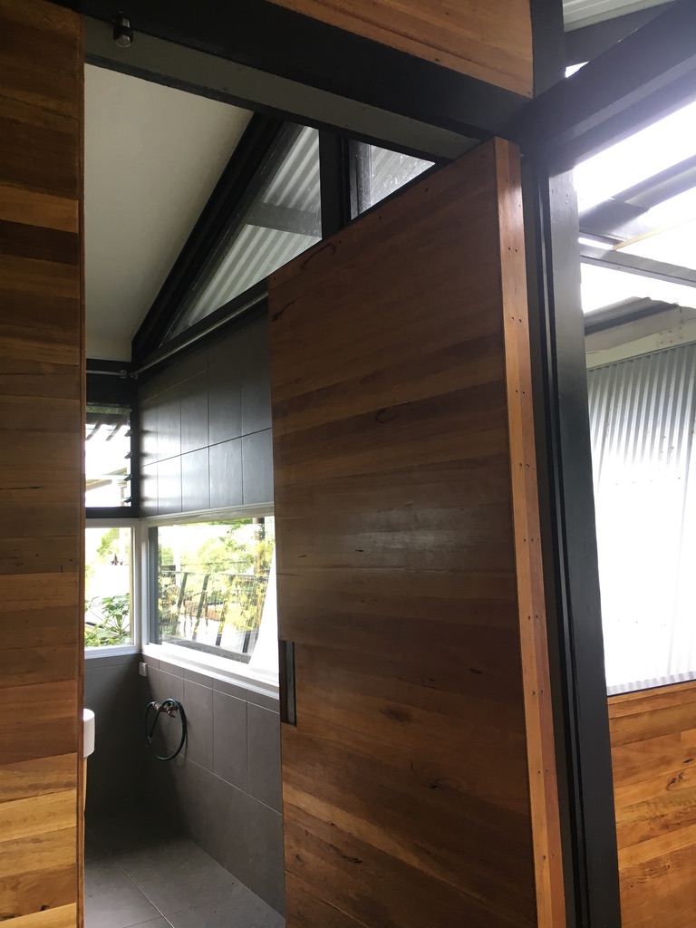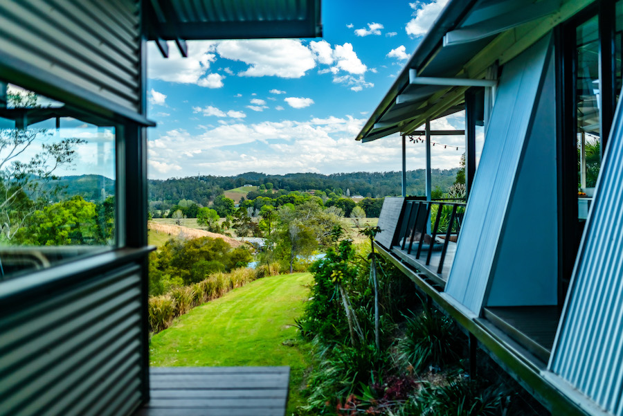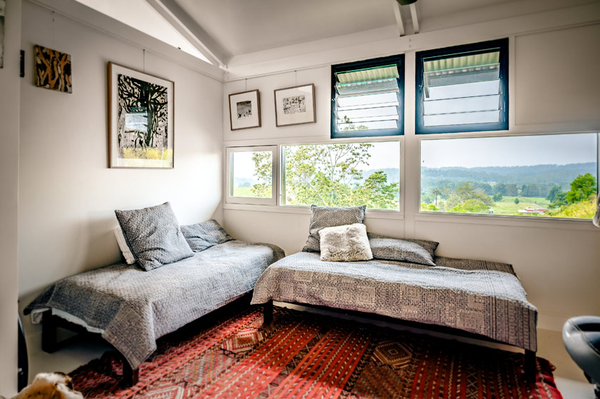 The night time pavilion is semi open plan with 3 bedrooms, two bathrooms, a home office and an outdoor bedroom over two levels. All rooms have views to the dam and the Bellingen valley to the south. The levels are connected by a solid pink paint finish hardwood stair. The dwelling features external access decks.