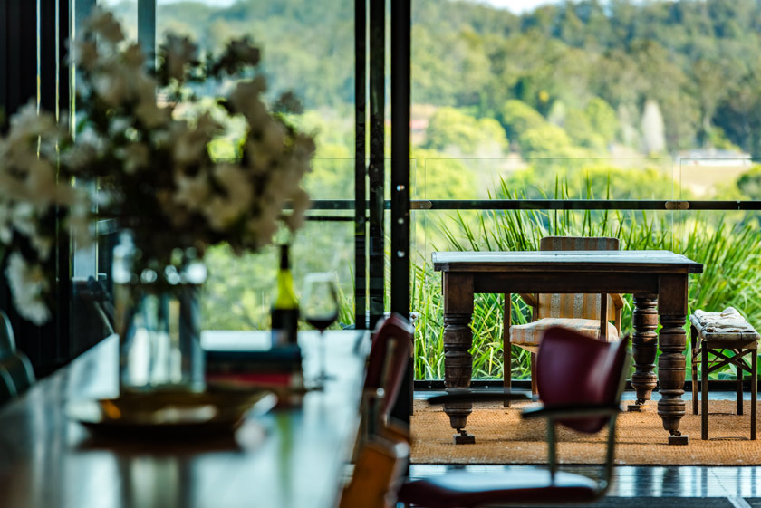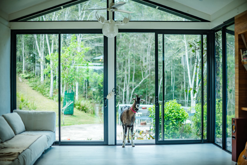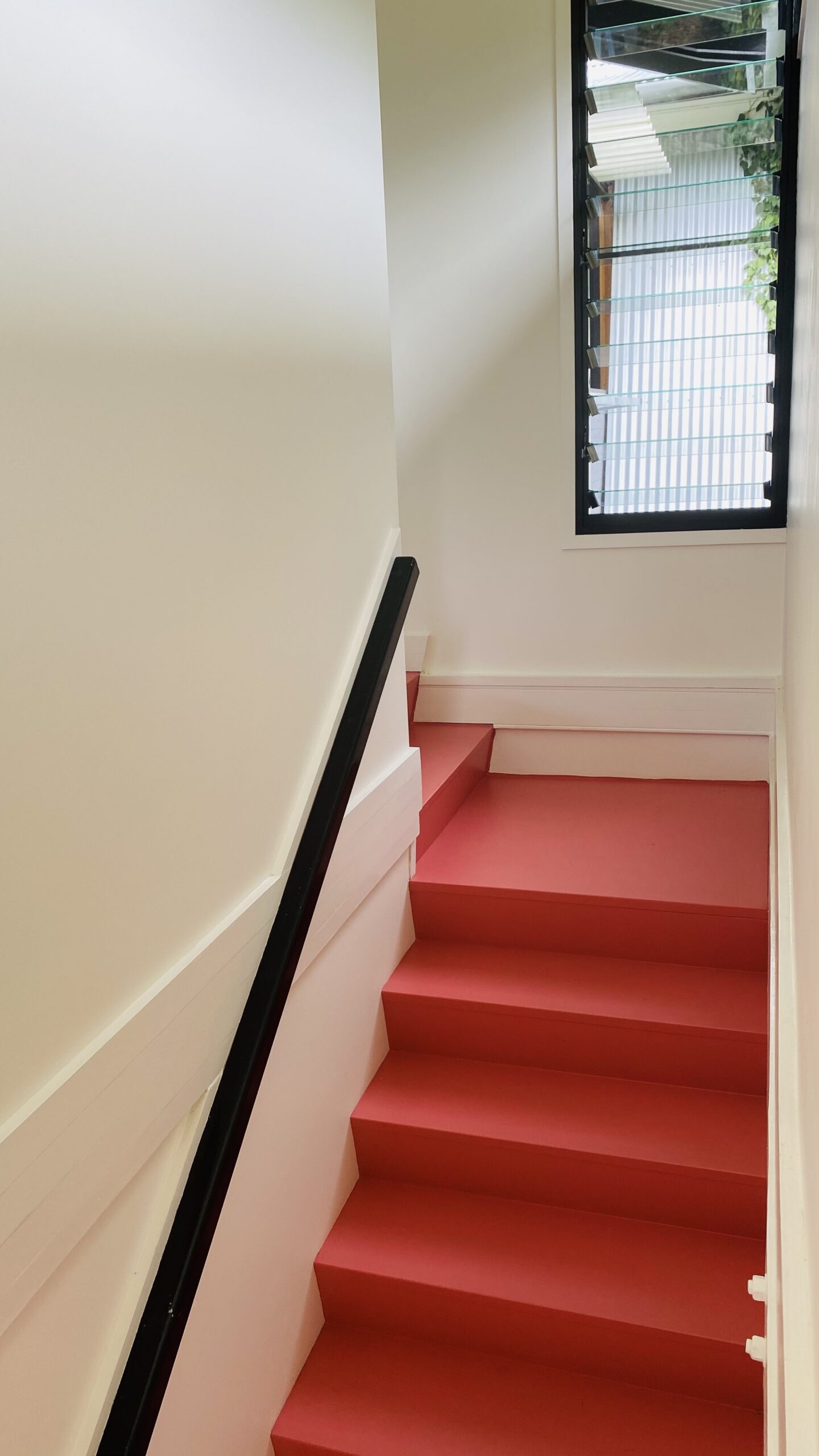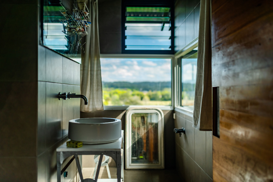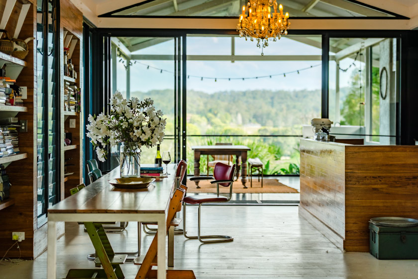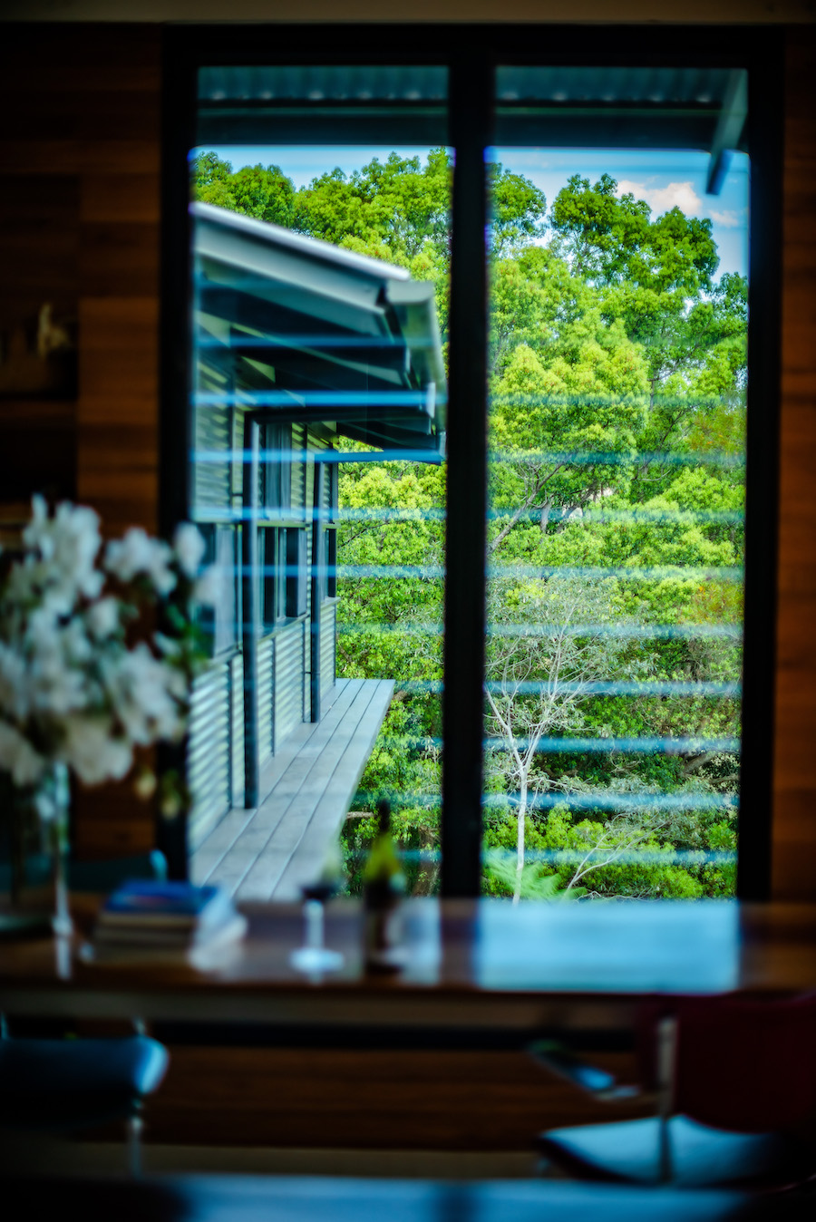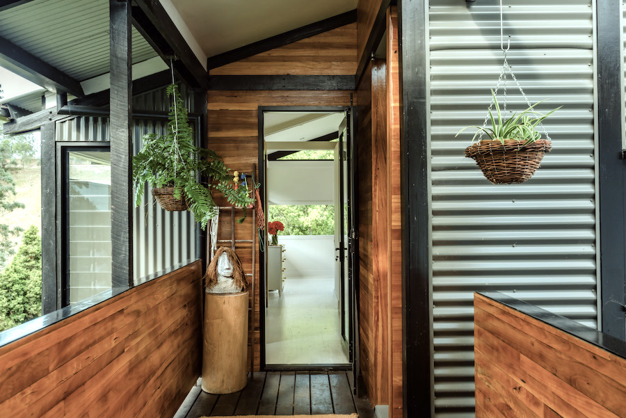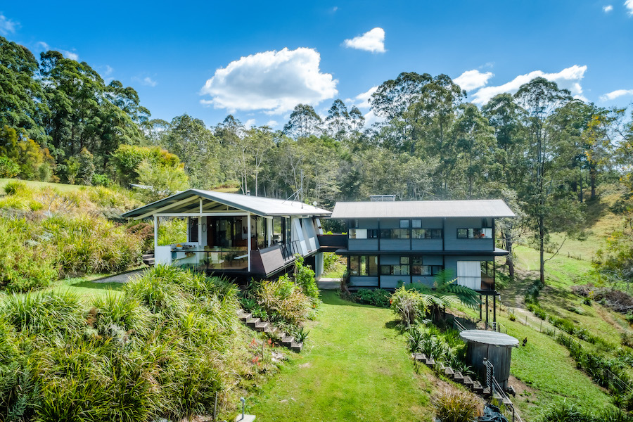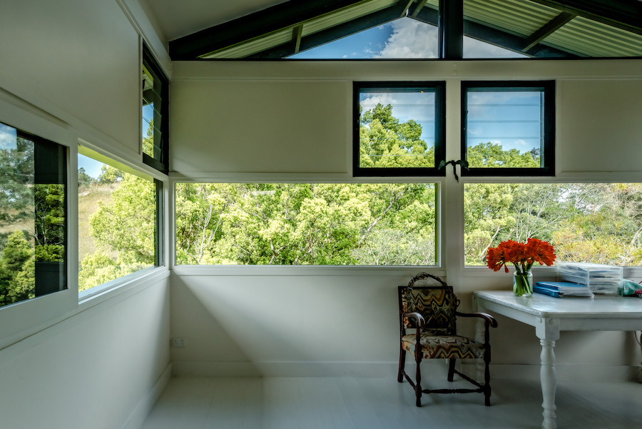 The night time pavilion is semi open plan with 3 bedrooms, two bathrooms, a home office and an outdoor bedroom over two levels. All rooms have views to the dam and the Bellingen valley to the south. The levels are connected by a solid pink paint finish hardwood stair. The dwelling features external access decks.