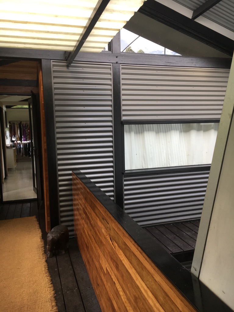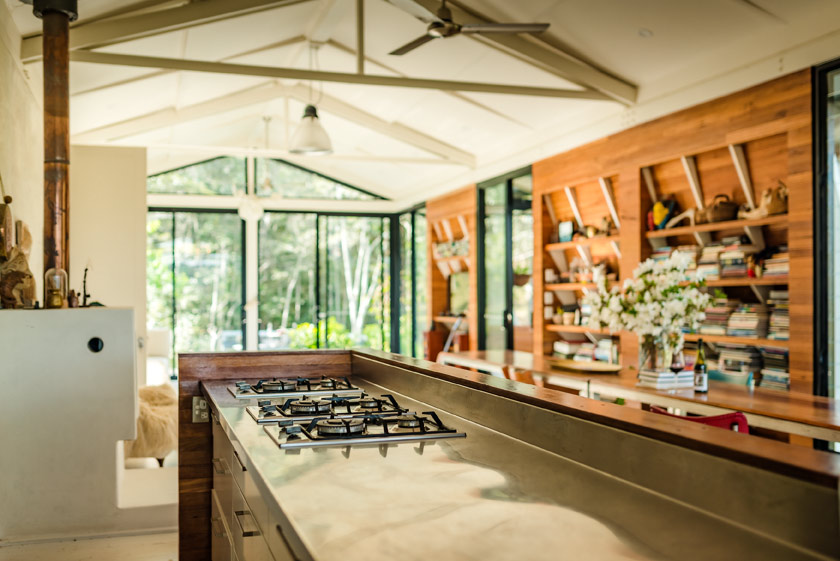 The main living pavilion has a galley style kitchen with stainless benches, cupboard doors and third wood timber finishes. There are four angles wall alcoves that feature tapered bookshelves all in hardwood and interspersed by full height louvre windows. The floors are painted hardwood tongue and groove timber reminiscent of European interiors. There is combustion heater built into a rendered masonry surround. Cathedral ceilings with ceilings tapered between purlins are lit by double ended gable clerestory windows and extend out to a large veranda with outdoor kitchen and glass and steel balustrades.