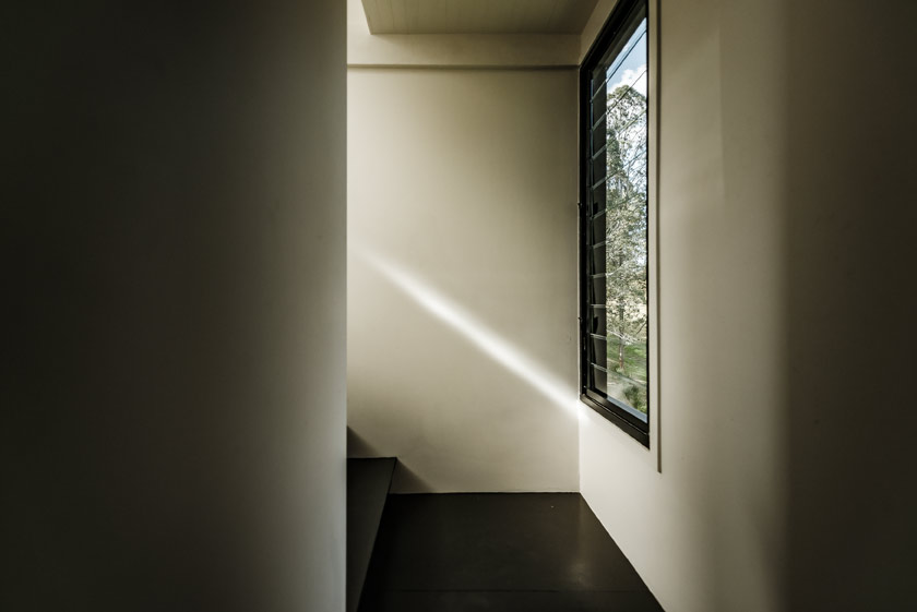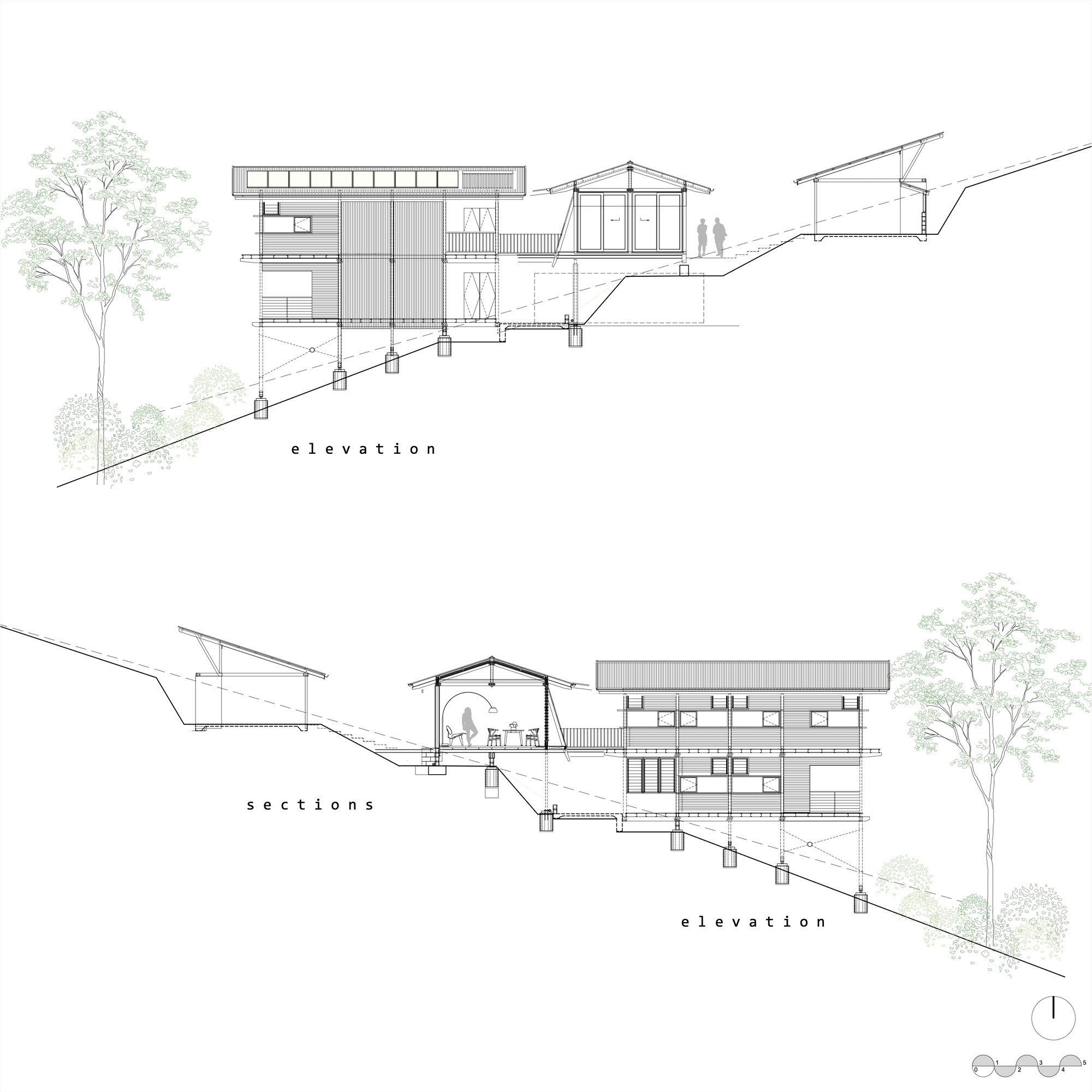 This modern interpretation of the vernacular Australian verandah pavilion evolved out of a site with multiple constraints. With a steep slope orientated to the east, panoramic views to the south and a high fire danger to the west benefits. With a series of bridges connecting three volumes; carport, single level living pavilion (built along the slope) and two level ‘Sleeping’ pavilion (built perpendicular to the slope) views, solar gain, ventilation and ‘nestling’ in the slope were optimised.